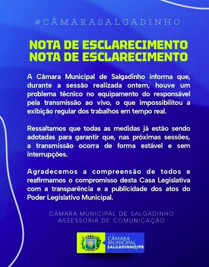 A Câmara Municipal de Salgadinho informa que, durante a sessão realizada ontem, houve um problema técnico no equipamento do responsável pela transmissão ao vivo, o que impossibilitou a exibição regular dos trabalhos em tempo real. Ressaltamos que todas as medidas já estão sendo adotadas para garantir que, nas próximas sessões, a transmissão ocorra de forma […]